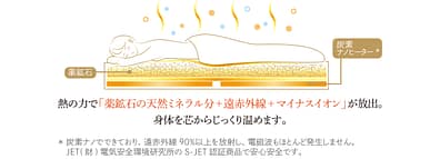 薬石を温めるカーボンセラミックは、原料が炭素なので「カーボン=炭素」で、同じ重さの鉄の数百倍の強度を持つ、今注目の新素材です。主原料は炭素ナノでできており、遠赤外線90%以上を放射し、電磁波もほとんど発生しません。温度の約90%を遠赤外線で放出します。火気を使用しないため安全です。 (財)電気安全環境研究所JET S認証を取得しています。カーボンナノチューブの特性のひとつは、温度の上昇が早く、設定温度に暖まるまでの時間を短縮できることです。ランニングコストの削減も期待できます。