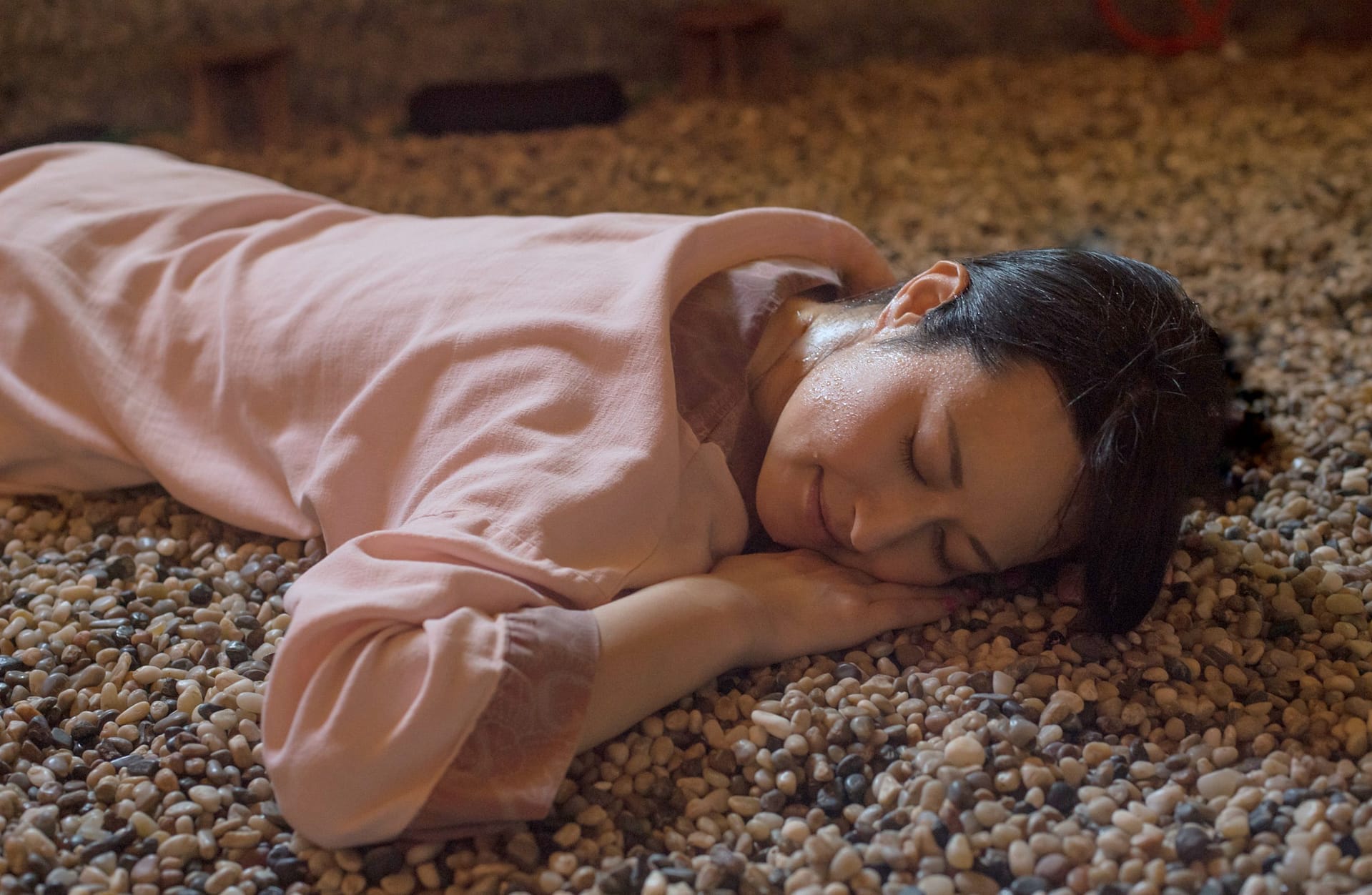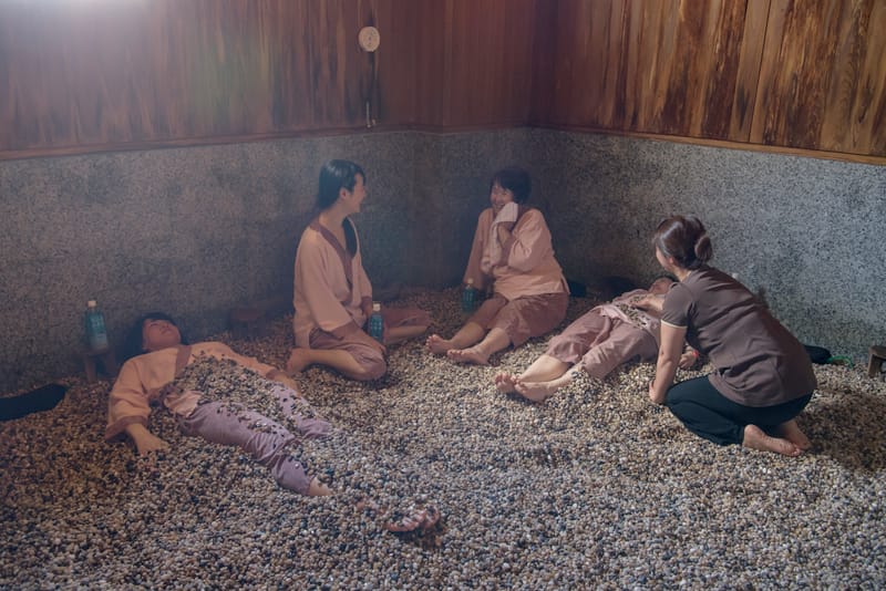 嵐の湯の室内には、日本の大地が育んだ15種類の薬鉱石を敷き詰め、湯河原温泉を撒いています。