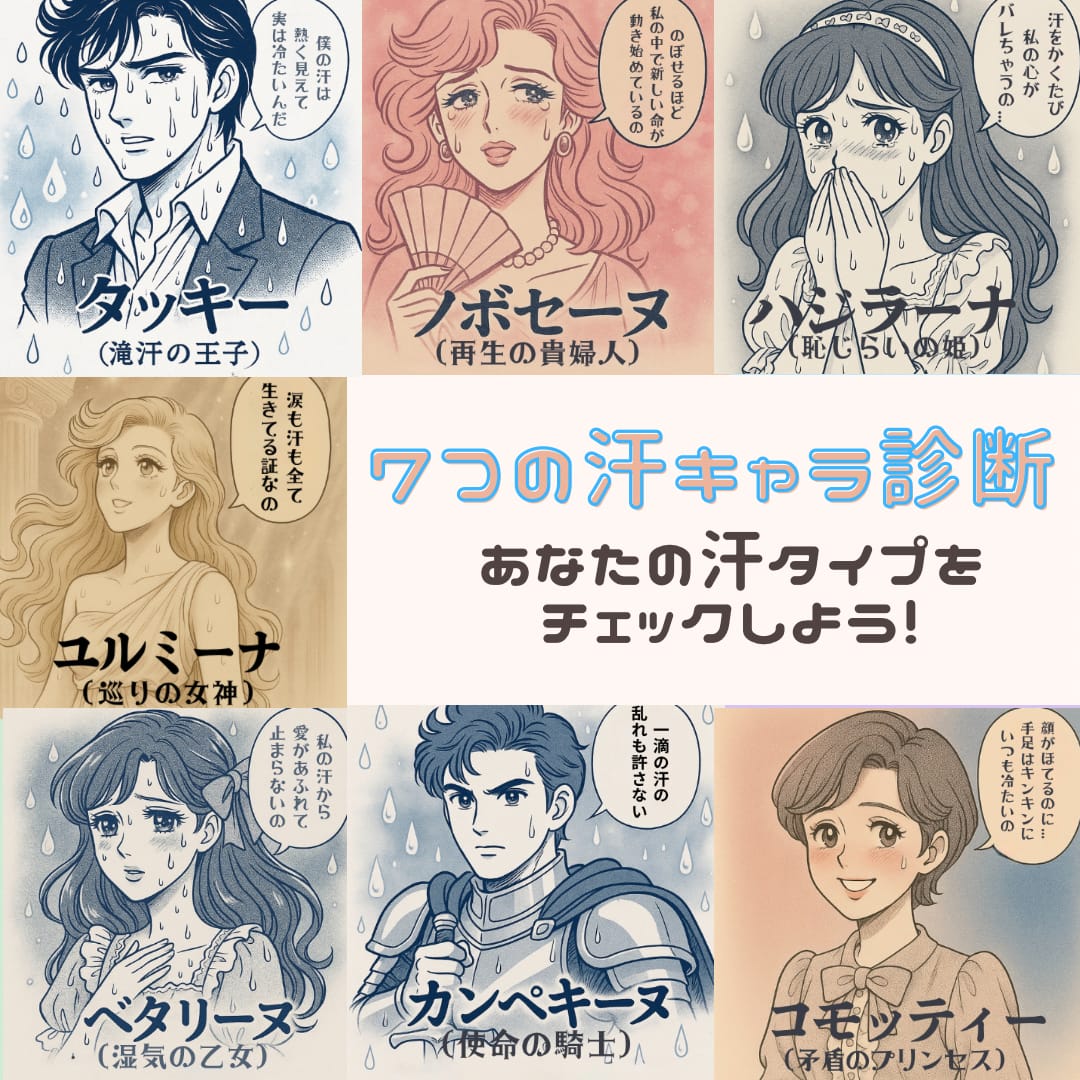 「7つの「汗キャラ」タイプ診断|あなたの汗タイプをチェックしよう!」 汗は、心と体のコンディションを映す鏡!10問の質問に答えるだけで、あなたの中に眠る『汗キャラ』が分かります。結果では、タイプ別に「今の体の状態や」「整え方のヒント」もお伝えします。【所要時間3分】直感的に選ぶだけでOK!楽しみながら“本来の自分“を知ってみてください。 診断スタート1ページ目 (10ページ中) 外出から冷房/暖房の部屋に入ると? 手足がすぐに冷える 顔が熱くなってのぼせる 寒暖差にだるさを感じる 全身から汗が止まらない どれも当てはまらない 2ページ目 (10ページ中) どんな時に一番汗をかく? 緊張しているとき 冬でも熱くて汗をかく 意識的に汗をかくよう心がけている 急に汗が噴き出すことがある あまり汗はかかない 3ページ目 (10ページ中) 体のどこから汗をかきやすい? 頭や背中から汗をかく 上半身に汗をかきやすい 手や顔、ワキに汗をかきやすい あまり汗はかかない バランスよく全身からじんわりかく 4ページ目 (10ページ中) 汗の質は? ベタベタ少しこもった匂いがする サラッとして清々しい 熱を帯びた汗ですっきり感がある 緊張するとツンとした匂いが出る 汗はほとんど出ない 5ページ目 (10ページ中) 飲み物の好みは? 氷の入ったよく冷えたものを好む 温かいお茶が好き すぐに喉が渇く 甘い飲み物が好き 常温の水やお茶をちょこちょこ飲む 6ページ目 (10ページ中) 汗をかいた後の気分は? ベタついて不快、サッパリしない 顔だけほてってスッキリしない 汗が引くと寒く感じる スッキリ気分も晴れる グッタリして少しだるくなる 7ページ目 (10ページ中) 性格を一言で言うと? 我慢強いが溜め込む 日によって感情の浮き沈みがある せっかち 恥ずかしがり屋で繊細 のんびりマイペース 8ページ目 (10ページ中) 緊張するとどうなる? 顔から汗がダラダラ 手やワキから汗が汗が出る 首や肩が緊張する 急に身体が熱くなって汗が噴き出す どれも当てはまらない 9ページ目 (10ページ中) 人前で話す時や注目されると? 手やワキが汗ばむ 俄然張り切る 顔が熱くなり汗が噴き出す なるべく目立ちたくない どんな時も楽しむ 10ページ目 (10ページ中) イライラすると? 顔が熱くなる 頭痛や肩や背中が張る 手や脇に汗 つい食べすぎてしまう うまく発散できる 送信の準備完了続行するには連絡先情報を入力してください。メールアドレス *名 *チェックボックス女性男性その他性別(任意)チェックボックス *10代20代30代40代50代60代70代以上年齢(年代をお選びください)個人情報の取り扱いについての同意 *この診断は、結果をお届けするためにメールアドレスなどの個人情報を入力いただきます。ご入力いただいた情報は、診断結果の送付および今後のお知らせのご案内に使用する場合があります。内容に同意のうえ、送信してください。送信